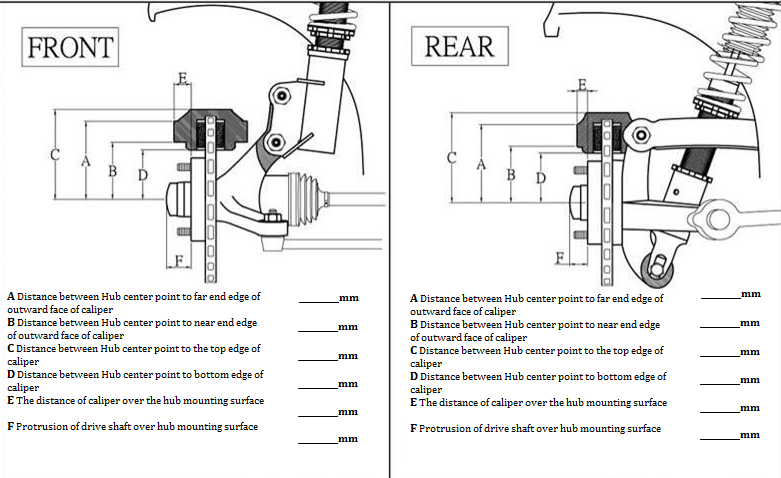 1) Select size2) Select PCD3) Select offset4) Select Center Bore5) Select center cap6) Select hardware bolts7) Select center disc color finish8) Select outer lip color finish9) Select inner barrel color finish10) Download the file for measuring brake calipers, fill it out and upload it. Or upload your caliper drawing fileNote: You can print the file and fill it out, then take a photo and upload it